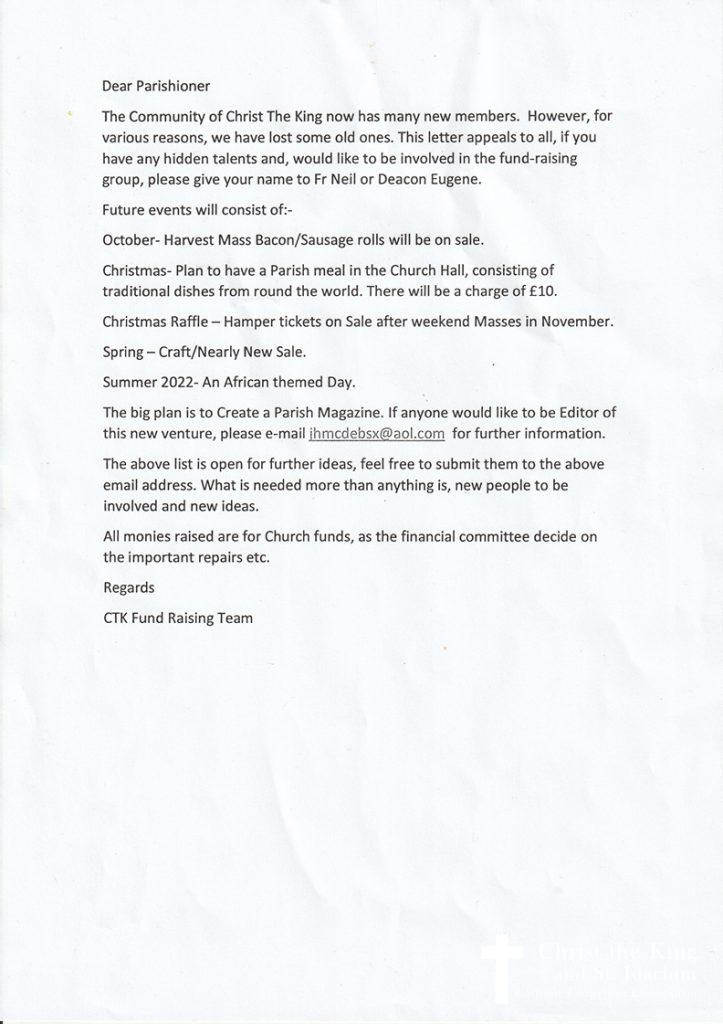 to support our parish community. Please see a copy of the letter from the CTK Fund Raising Team. The first event is the Harvest. Thanksgiving bacon/sausage roll sale after Sunday Mass 03/10/2021.